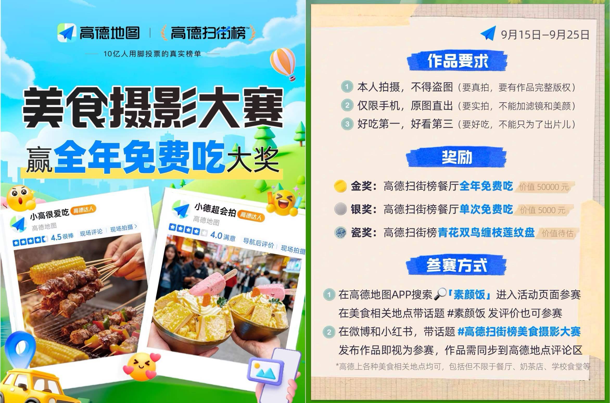 9月15日,高德扫街榜开动首届好意思食影相大赛,面向环球网友搜集好意思食影相作品,网友可在高德舆图搜索“素颜饭”上传参赛作品。大赛金奖得主将赢得“高德扫街榜”上榜餐厅全年免费吃职权,获奖名单将于9月25日公布。