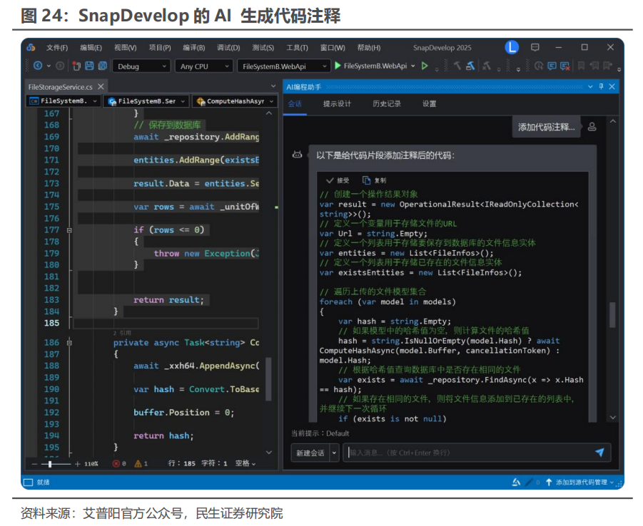 AI编程展翅:收购切入基础软件领域,“AI+编程”大开长久成漫空间。2023年公司收购深圳艾普阳52%股权,2024年9月拟2.73亿元收购艾普阳科技剩余48%股权落幕100%控股。2023年艾普阳落幕营业收入0.94亿元,净利润0.46亿元。IDE研发插手大、周期长、难度高。艾普阳科技自主研发的低代码ID居品SnapDevelop领有自主常识产权,恰当信创国产替代需求,可替代国外主流交易开发器具的同等功能,对IDE基础软件的国产化程度激动具有要紧策略预见。SnapDevelop现在已积蓄近 4000 名用户,主要维持.NET 平台的云原生应用开发,而群众有超 600 万.NET(C#)开发东说念主员,潜在市集空间较大。同期,SnapDevelop现在照旧落幕和AI功能的深度和会,无需离开IDE即可使用优质 AI 做事,举例提供精确的代码建议,添加代码能干,代码会诊与优化等,全面种植编码效果。
