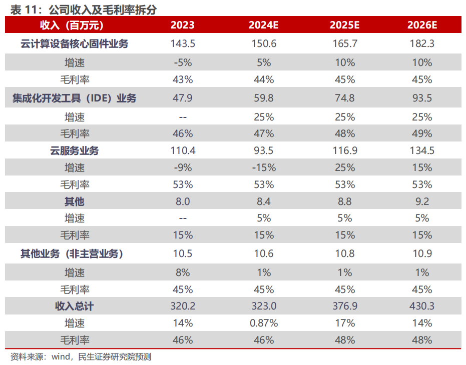 云计较设备中枢固件业务:1)收入:笔据《2023-2024 中国东说念主工智能计较力发展评估讲解》,IDC瞻望群众东说念主工智能硬件市集(做事器)规模将从 2022 年的195亿好意思元增长到2026年的347亿好意思元,2022-2026年复合增长率达17.3%;笔据《海光信息2023年度讲解》,瞻望2027年中国东说念主工智能做事器出货量将达到69.1万台,2023-2027年复合增长率达21.60%,全体行业景气度将会保持在较高水平。同期,公司不仅是国内独一的X86架构 BIOS 和BMC固件供应商,照旧少数同期具备开发ARM、MIPS、Alpha等CPU架构用BIOS居品能力的大陆厂商,亦然信创领域中枢厂商,因此改日瞻望受到国产替代利好,关联业务有望加快发展。瞻望2024-2026年增速分手为5%、10%、10%。2)毛利率:研讨到公司业务模式和市风光位相对健硕,固件业务有望受国产替代利好,而公司在国产厂商里面具有光显上风,因此因此瞻望毛利率小幅种植,瞻望2024-2026年毛利率分手为44%、45%、45%。
