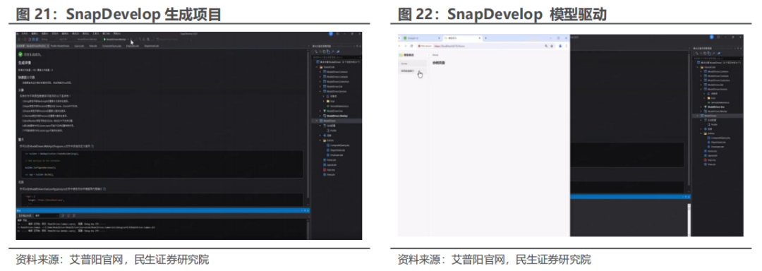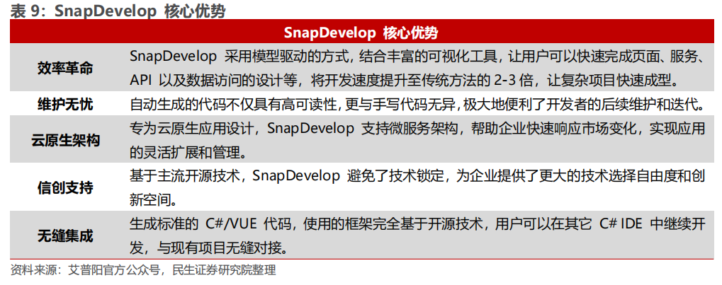 发力国产替代,打造新址品助力基础软件国产化。艾普阳科技自主研发的.NET云原生低代码IDE器具居品SnapDevelop(2023 年底测试版块居品名为 DevMagic Studio),于 2024年 6 月发布 GA 版块 SnapDevelop2025。艾普阳独家研发关联居品,用于为开源.NET 框架快速开发云原生应用活动,包括可视化器具和代码生成器,维持使用 Powerbuilder 开发的应用无缝升级。SnapDevelop是具有整个自主常识产权的、国内研发的开发器具,恰当信创国产替代需求。