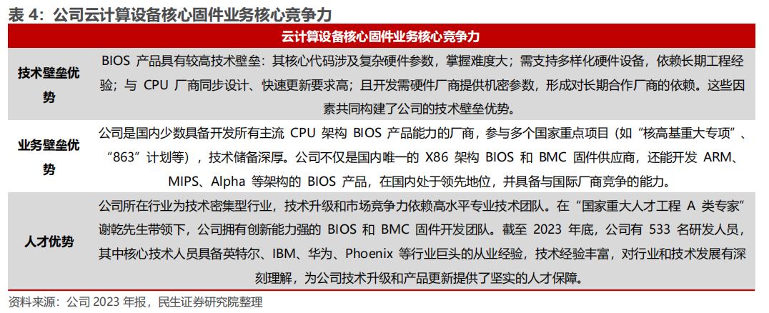 在国产芯片方面,公司具备相应的适配通盘主流国产芯片平台的开发能力,公司是国内少数具备开发通盘主流 CPU 架构 BIOS 居品能力的厂商, 能开发 ARM、MIPS、Alpha 等架构的 BIOS 居品,在国内处于最初地位,并具备与国际厂商竞争的能力。