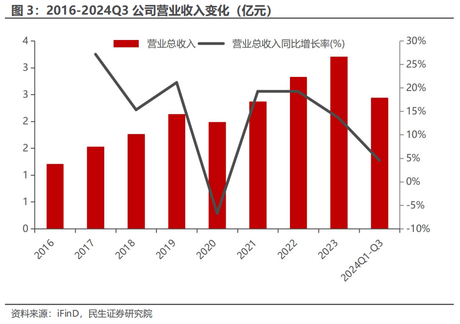 2)归母净利润端:2016年至2020年,公司归母净利润由2862.40万元增至5805.33万元,复合增速为19.34%。2021年,公司的归母净利润为4214.85万元,同比下落27.40%,主要受东说念主力老本上升及研发插手增多的影响。2021年至2023年,归母净利润由4214.85万元增至5616.05万元,复合增速为15.43%。2024年前三季度,公司归母净利润达到2008.84万元,同比下落62.84%;同期扣非归母净利润为552.09万元,同比增长5.79%。剔除非平常性成分的插手后,公司事迹增长保持相对健硕。